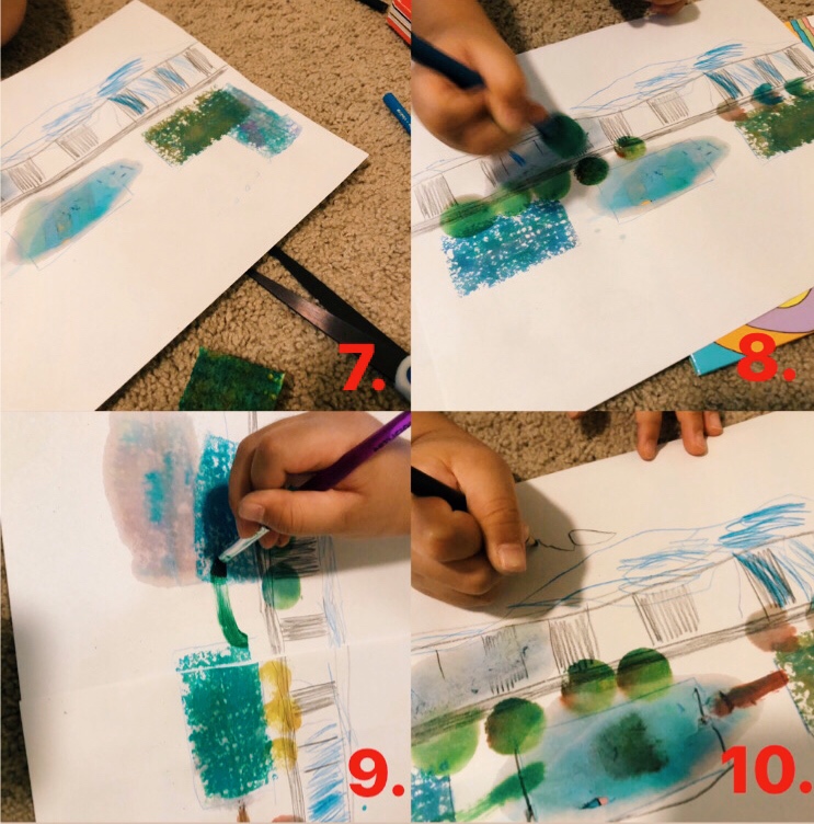 Picture no. 9 : He drew a line between one rectangle to others, to connect them. He also drew window on each rectangle using the circle sponge paint brush