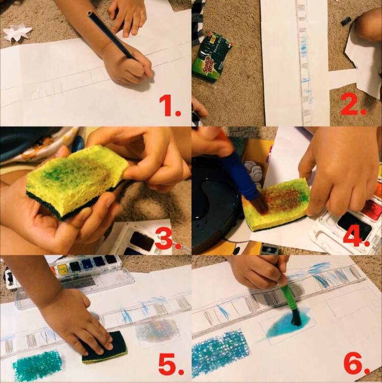 Picture no. 5 : I made rectangles for the train, so then it would be easier for him to know where to stamp using the sponge.